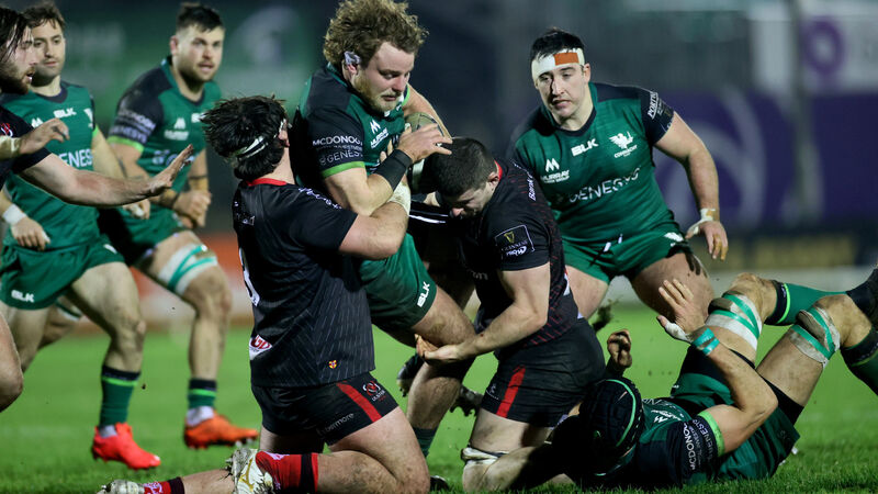 Ulster's Tom O’Toole and Nick Timoney tackle Finlay Bealham of Connacht. Picture: INPHO/James Crombie