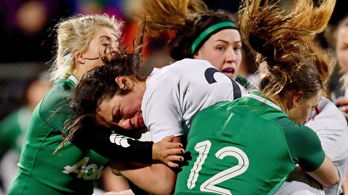 Rowena Burnfield of England is tackled by Ailsa Hughes, left, and Michelle Claffey of Ireland during the 2019 Women's Six Nations. The 2021 edition is in doubt as the Covid crisis continues across Europe. Picture: Ramsey Cardy/Sportsfile
