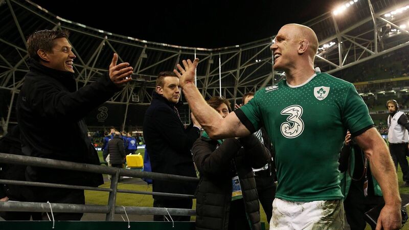 Paul O'Connell, the new Ireland forwards coach, celebrates with former teammate Ronan O'Gara after a 2014 international at the Aviva Stadium. Picture: Brian Lawless