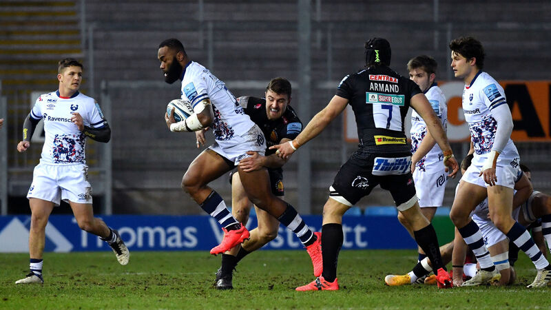 Bristol Bears' try-scorer Semi Radradra tackled by Exeter's Ollie Devoto during the Gallagher Premiership match at Sandy Park. Picture: Simon Galloway