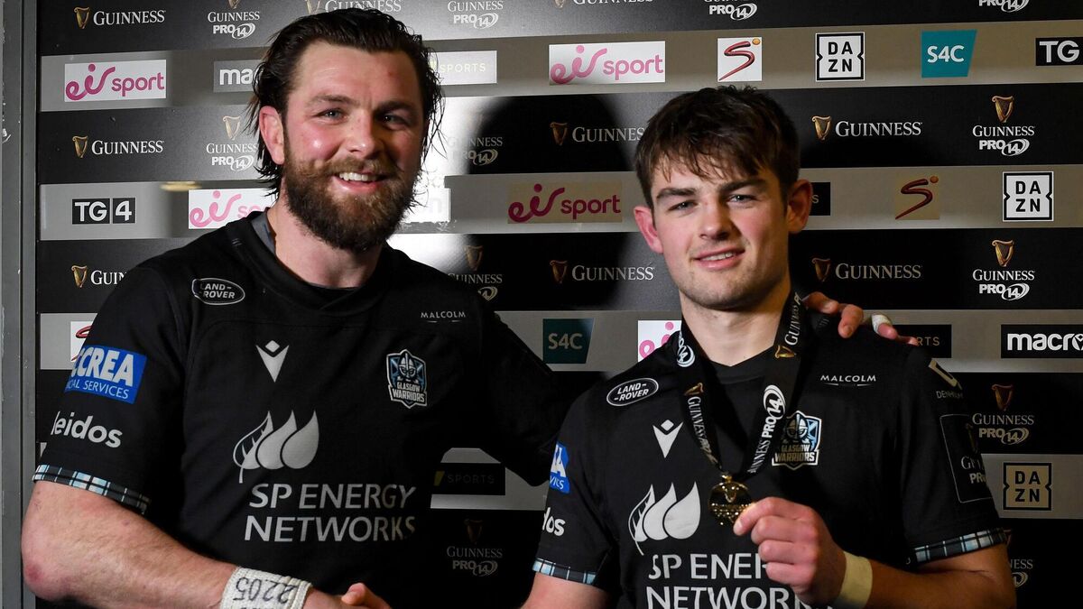 Glasgow Captain Ryan Wilson presents Ross Thompson with his Guinness PRO14 Player of the Match medal after the game
