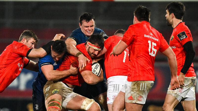 Jean Kleyn of Munster is tackled by Rónan Kelleher, left, and James Ryan of Leinster