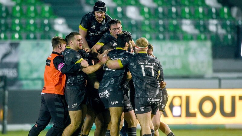 LATE SHOW: Munster players celebrate with JJ Hanrahan after he converted a drop goal in the final seconds to win the match.