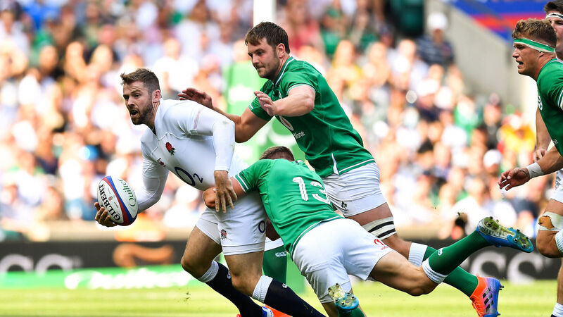 Elliot Daly of England is tackled by Garry Ringrose and Iain Henderson of Ireland during a 2019 international. Daly and England are dealing with strict Covid-related guidelines ahead of the Six Nations. Picture: Brendan Moran/Sportsfile