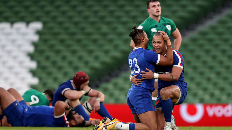 France's Teddy Thomas and Gael Fickou celebrate at the final whistle. Picture: INPHO/Dan Sheridan
