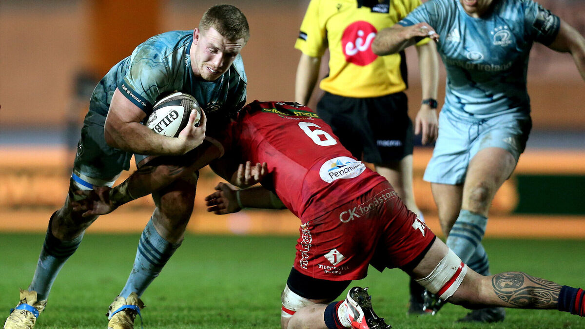 Leinster's Dan Leavy is tackled by Blade Thomson of Scarlets. Photo by Gareth Everitt/Sportsfile