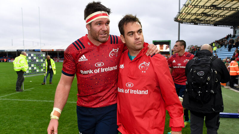 Billy Holland and Munster head coach Johann van Graan. Photo by Brendan Moran/Sportsfile