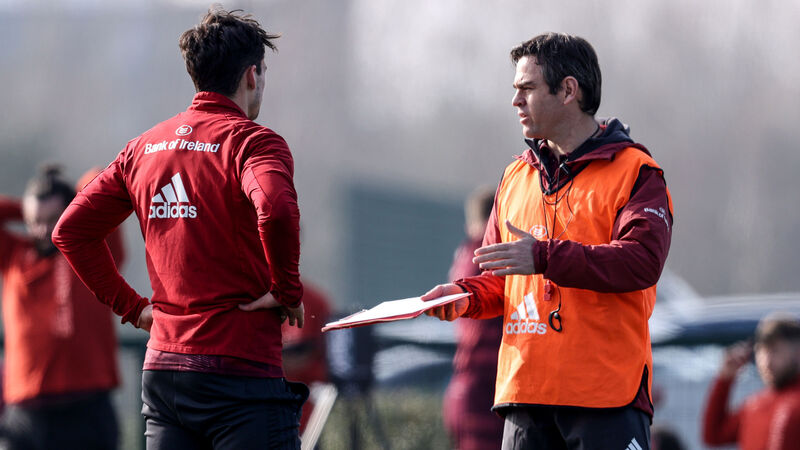 ONE STEP AT A TIME: Munster coach Johann van Graan talks to Joey Carbery during training at UL. Van Graan is at pains to urge patience with Carbery’s return.