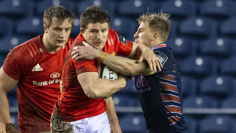 Andrew Conway of Munster is tackled by Jaco van der Walt of Edinburgh during the Guinness PRO14 match