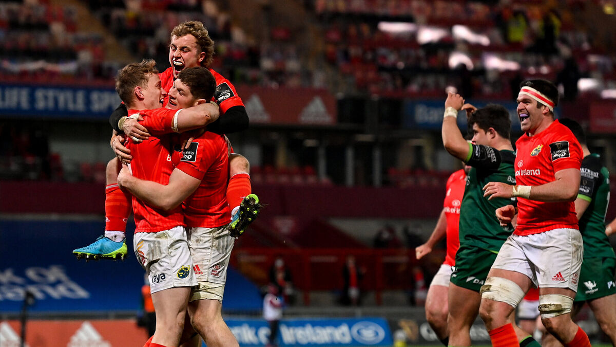 Mike Haley, left, celebrates with Munster team-mates Craig Casey, Jack O'Donoghue and Billy Holland after scoring his side's second try. Picture: Ramsey Cardy/Sportsfile