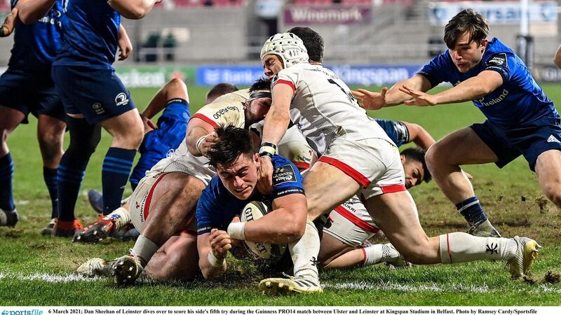 Leinster's Dan Sheehan dives over to score his side's fifth try during their Guinness PRO14 match against Ulster at Kingspan Stadium.Â