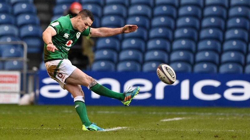 Johnny Sexton of Ireland kicks the winning penalty as Ireland beat Scotland after losing a 14-point lead in the second half. Picture: Stu Forster