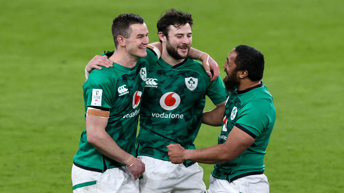 Ireland's Johnny Sexton, Robbie Henshaw and Bundee Aki celebrate after the game. Picture:Â INPHO/Billy Stickland