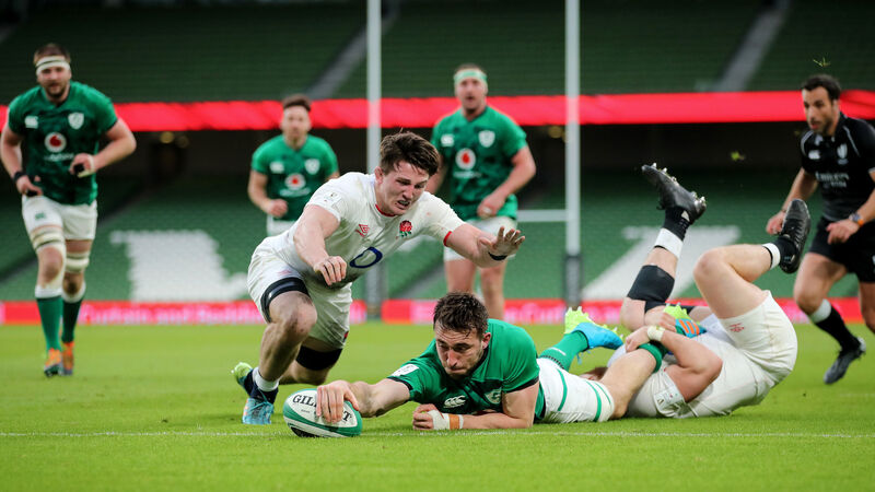 Ireland’s Jack Conan gets in for a try despite the efforts of England’s Luke Cowan-Dickie and Tom Curry. Picture: James Crombie/Inpho