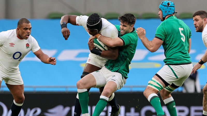 Conor Murray, who was excellent against England, gets to grips with Maro Itoje in the Six Nations clash at the Aviva Stadium. Picture: Billy Stickland
