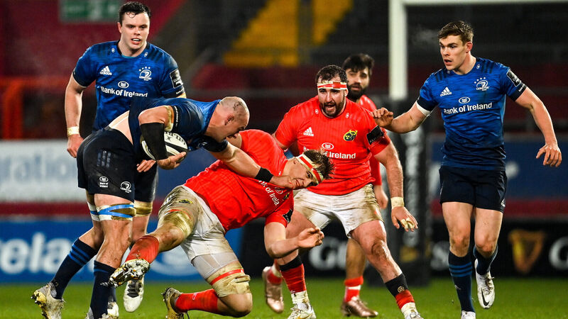 Rhys Ruddock of Leinster is tackled by Gavin Coombes of Munster during the Guinness PRO14 match at Thomond Park last January. Picture: Ramsey Cardy/Sportsfile