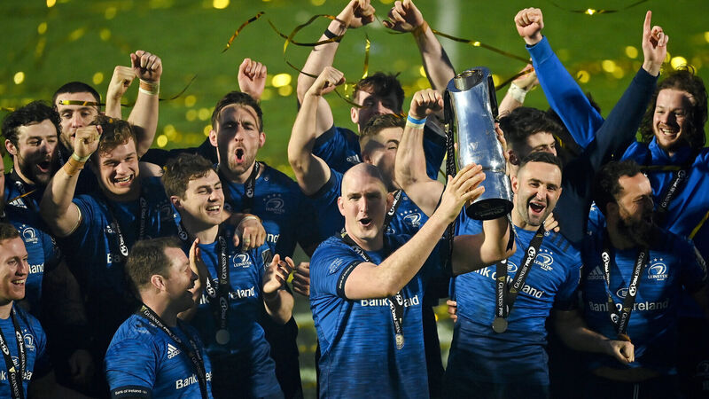 27 March 2021; Devin Toner of Leinster and his teammates celebrate with the the PRO14 trophy after the Guinness PRO14 Final match between Leinster and Munster at the RDS Arena in Dublin. Photo by Brendan Moran/Sportsfile