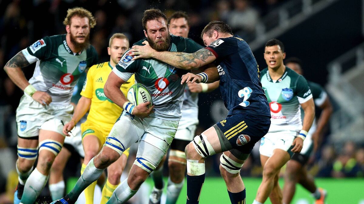 The Bulls' Jason Jenkins is tackled by Liam Squire of the Highlanders during a Super Rugby game in June 2019. Picture: INPHO/Photosport/Joe Allison