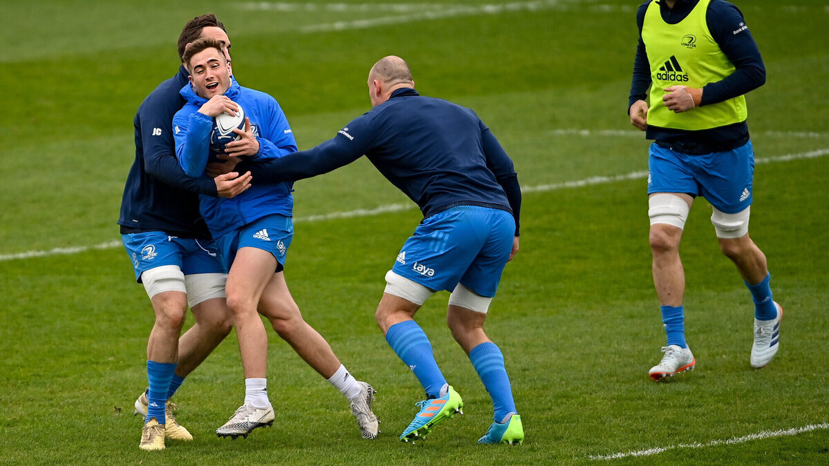 Jordan Larmour is tackled by Jack Conan, left, and Rhys Ruddock during the Leinster Rugby captains run at the RDS Arena. Photo by Ramsey Cardy/Sportsfile