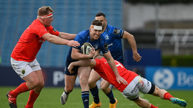 Rory O'Loughlin of Leinster is tackled by John Ryan and Andrew Conway of Munster during the Guinness PRO14 final. Picture: Brendan Moran/Sportsfile