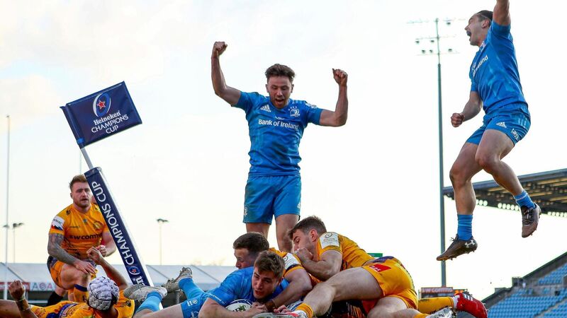 Leinster's Hugo Keenan and James Lowe celebrate as Jordan Larmour scores a try