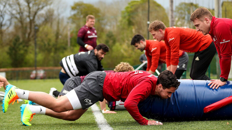 Joey Carbery feels the strain under the watchful gaze of Rory Scannell at Munster training yesterday. Carbery’s return from long-term injury in recent weeks does feel like a new signing, says Peter O’Mahony.