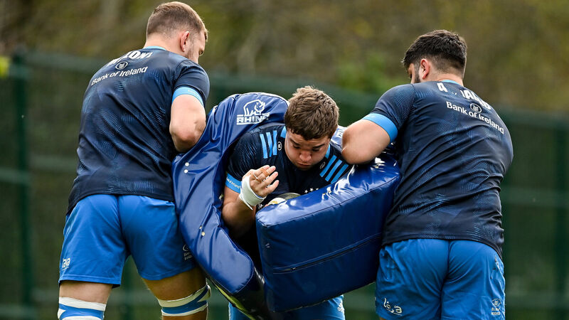 19 April 2021; Scott Penny in action against team-mates Ross Molony, left, and Vakh Abdaladze during Leinster squad training at UCD. Picture: Brendan Moran