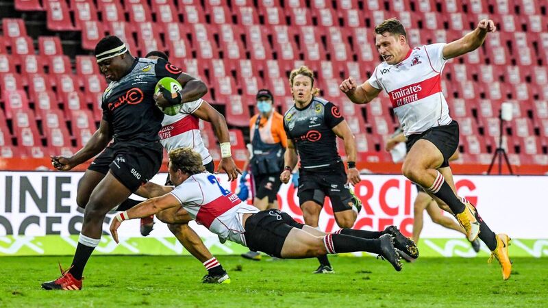 LOCAL DERBY: Sharks’ Ntuthuko Mchunu on his way to score a try against the Lions in the SA Rugby Preparation Series clash at Emirates Airline Park, Johannesburg. The Rainbow Cup SA will be another extension of those ‘competitions’ and the novelty has completely worn off.