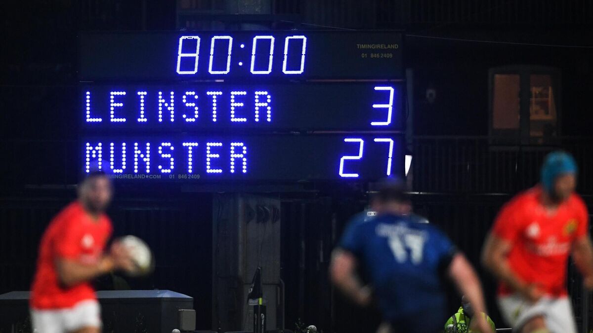 A general view of the scoreboard, displaying the final score, in the closing stages of the Guinness PRO14 Rainbow Cup match between Leinster and Munster. Picture: Piaras Ó Mídheach/Sportsfile