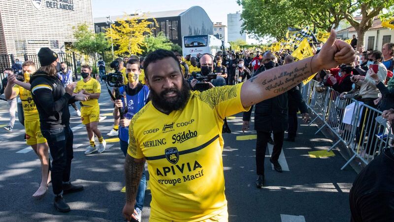 SOAKING IT UP: La Rochelle prop Uini Atonio celebrate their semi-final win over Leinster with fans outside the Stade Marcel Deflandre.