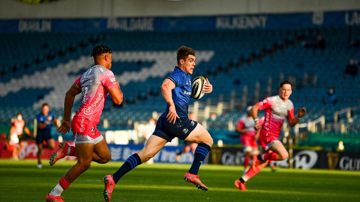 Garry Ringrose of Leinster on his way to scoring a try during the Guinness PRO14 match against Dragons at RDS Arena in Dublin. Picture: Harry Murphy/Sportsfile