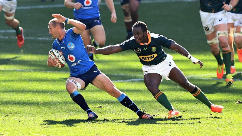Johan Goosen of the Vodacom Bulls moves away from Yaw Penxe during the match between South Africa A and Vodacom Bulls at Cape Town Stadium.Â