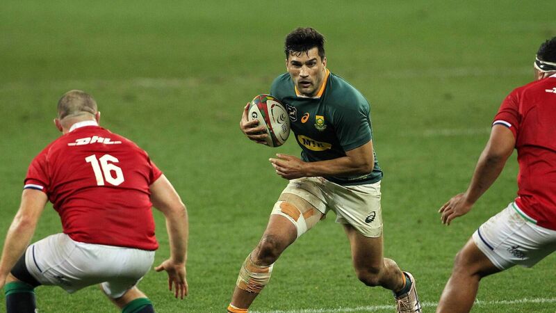 Damian de Allende of Springboks trying to run at Lions tacklers during the first Test. Picture: EJ Langner