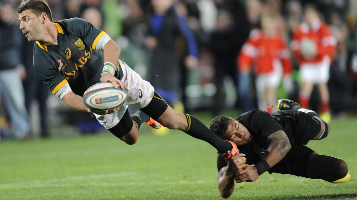 Willie le Roux of South Africa tackled by Charles Piutau of New Zealand during 2015 Rugby Championship. Picture: Ashley Vlotman/Gallo Images/Getty Images