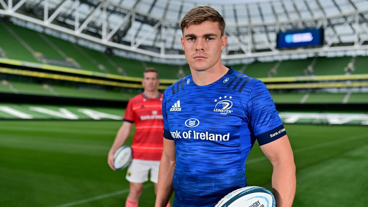 Garry Ringrose of Leinster and Chris Farrell of Munster, left, during the United Rugby Championship launch at the Aviva Stadium in Dublin. Photo by Brendan Moran/Sportsfile