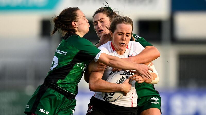 11 September 2021; Fiona Tuite of Ulster is tackled by Catherine Martin, left, and Ciara Farrell of Connacht during the Vodafone Women’s Interprovincial Championship Round 3 match between Connacht and Ulster at Energia Park in Dublin. Photo by Harry Murphy/Sportsfile