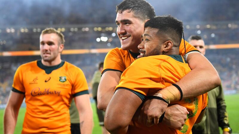 Darcy Swain of the Wallabies and Folau Fainga'a of the Wallabies embrace after winning The Rugby Championship match against South Africa at Suncorp Stadium.Â