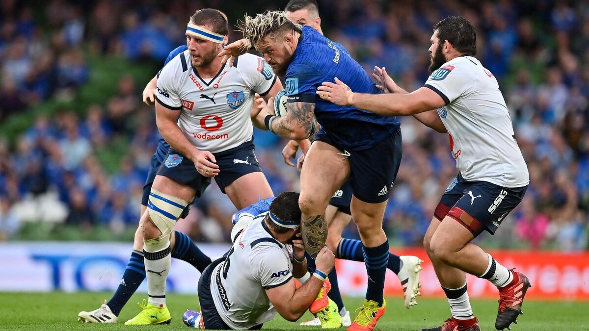 25 September 2021; Andrew Porter of Leinster is tackled by Marcell Coetzee and Mornay Smith of Vodacom Bulls during the United Rugby Championship match between Leinster and Vodacom Bulls at Aviva Stadium in Dublin. Photo by Brendan Moran/Sportsfile