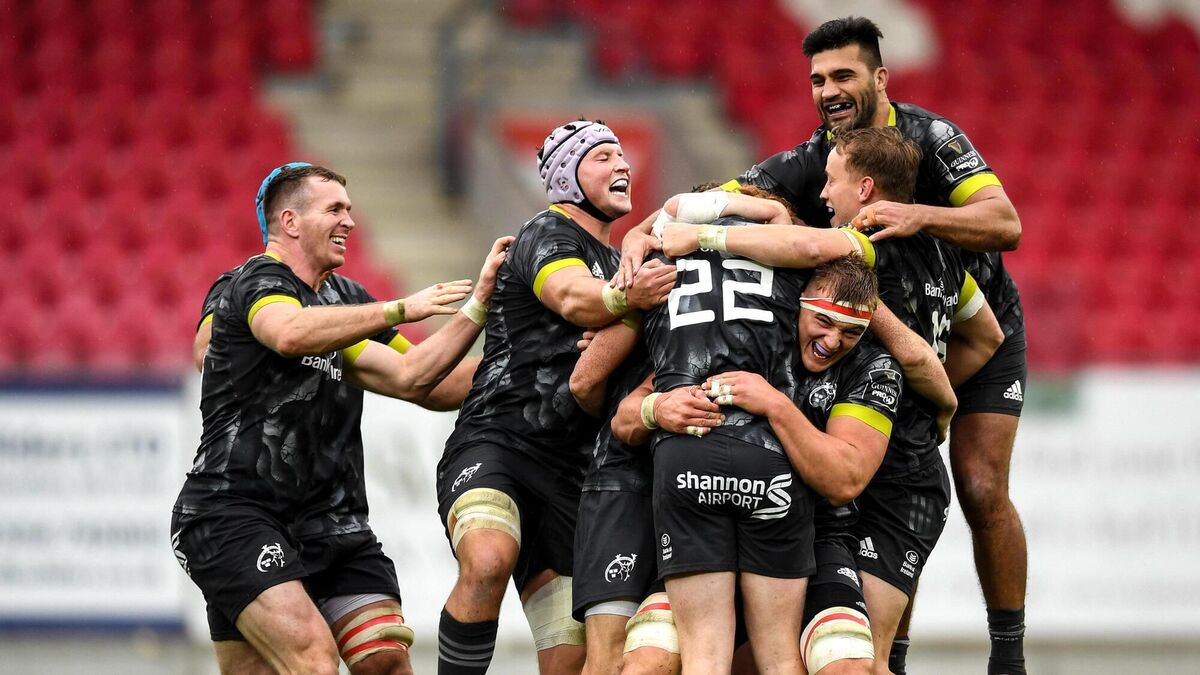 Munster players celebrate with Ben Healy following their side’s victory in the PRO14 match between Scarlets and Munster in Llanelli last year. Picture: Ben Evans/Sportsfile