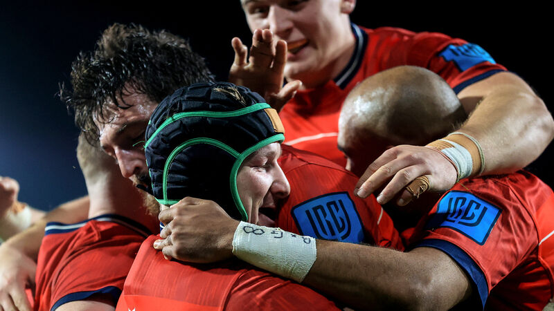 Munster's Chris Cloete celebrates after scoring a try with Simon Zebo. Picture: INPHO/Billy Stickland