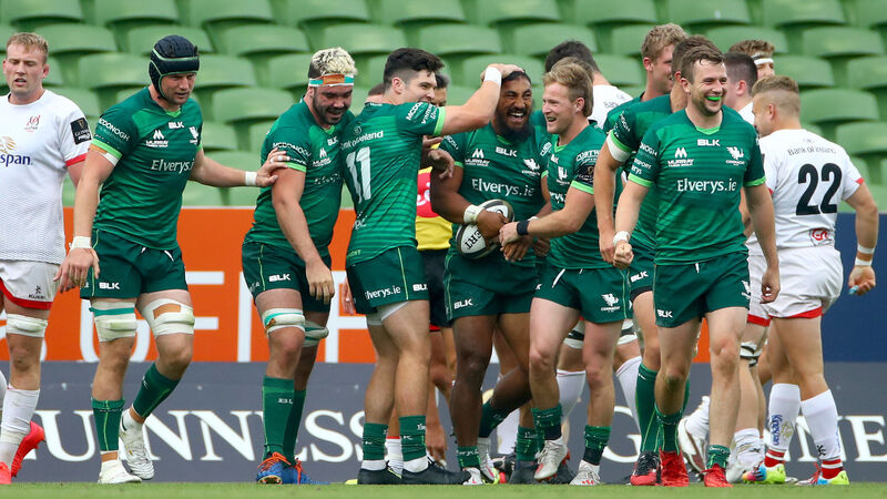 Connacht’s Bundee Aki celebrates his try with Alex Wootton and Kieran Marmion in their Aviva Stadium game against Ulster in August 2020. Picture: INPHO/James Crombie