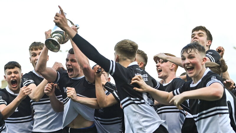 Newbridge College captain Paddy Taylor celebrates with the cup alongside his teammates after their victory in the Bank of Ireland Leinster Schools Junior Cup final against Blackrock College at Energia Park in Dublin. Picture: Piaras Ó MÃdheach/Sportsfile