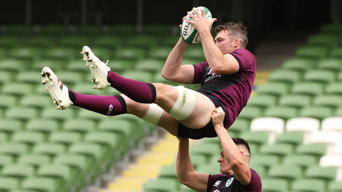 UPLIFTING: Dan Sheehan and Peter O’Mahony get in some lineout practice at the Captain’s Run in the Aviva Stadium.