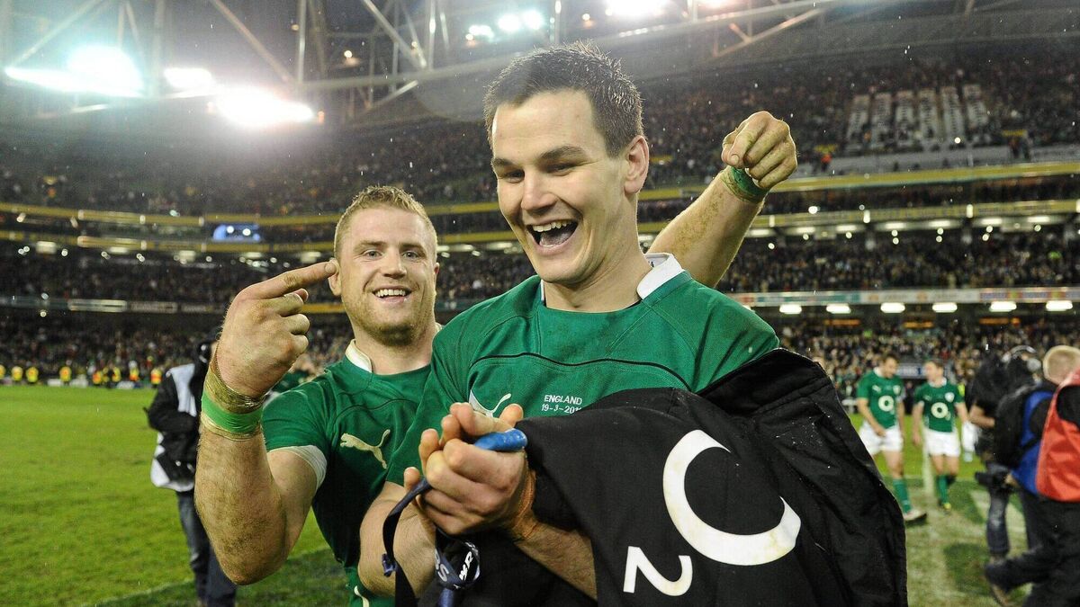 MAN OF THE MATCH! Jonathan Sexton and Jamie Heaslip celebrate victory over England back in March 2011.P