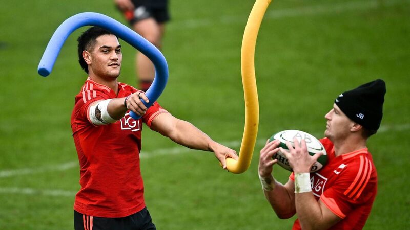 NOODLING AROUND: Quinn Tupaea, left, and Jordie Barrett at New Zealand squad training at the UCD Bowl in Dublin yesterday. Assistant coach John Plumtree warned New Zealand’s squad is ‘bouncing’ ahead of Saturday’s clash and will ‘come out swinging’.