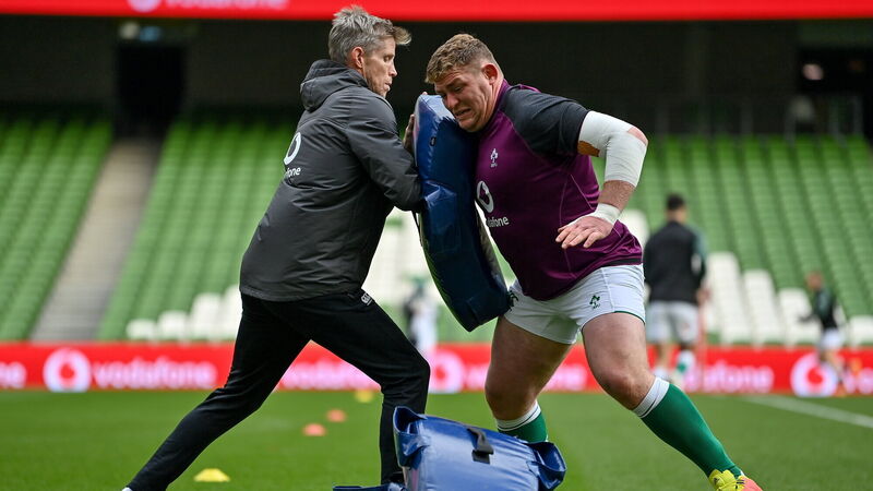 Tadhg Furlong with forwards coach Simon Easterby during Ireland's captain's run at Aviva Stadium in Dublin.