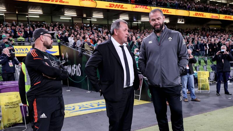 MUTUAL RESPECT: New Zealand Assistant coach Greg Feek and Head Coach Ian Foster chat with Ireland counterpart Andy Farrell after the game. Pic: Dan Sheridan, Inpho