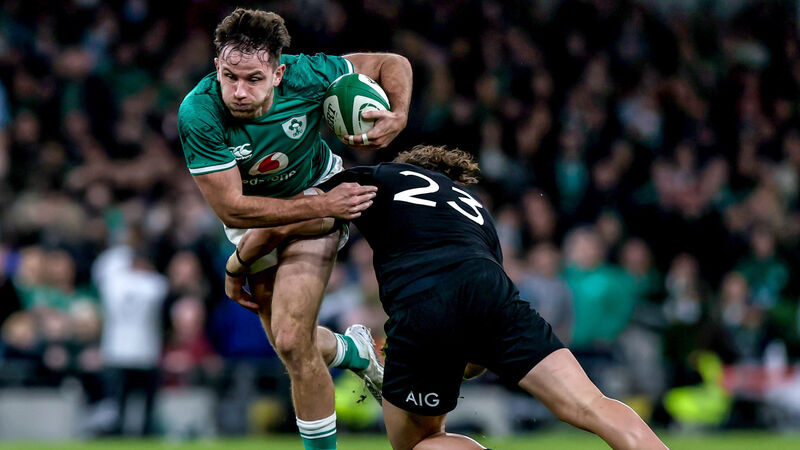 Ireland's Hugo Keenan comes up against David Havili of New Zealand. Picture: INPHO/Gary Carr