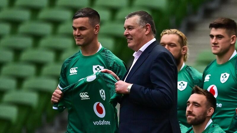 Ireland captain Jonathan Sexton makes a presentation to outgoing IRFU chief executive Philip Browne, who is hoping for between 45,000 and 50,000 for the Argentina match.