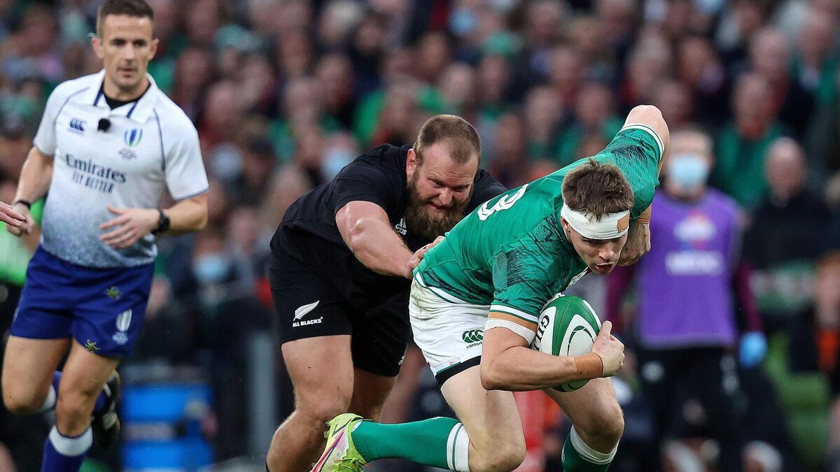 TACKLE TIRED: Ireland's Garry Ringrose evades the clutches of All Black prop Joe Moody. Picture: Bryan Keane, Inpho